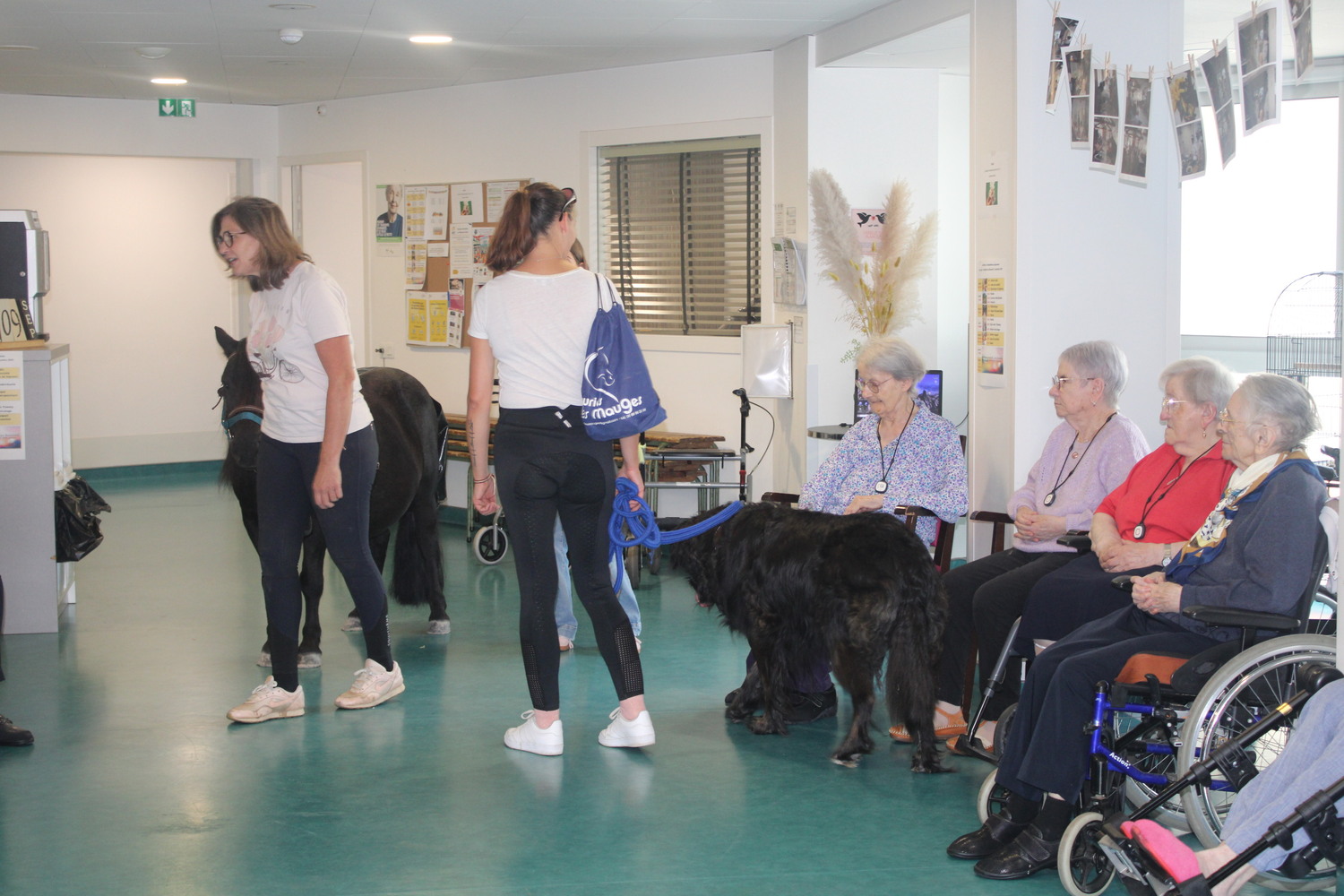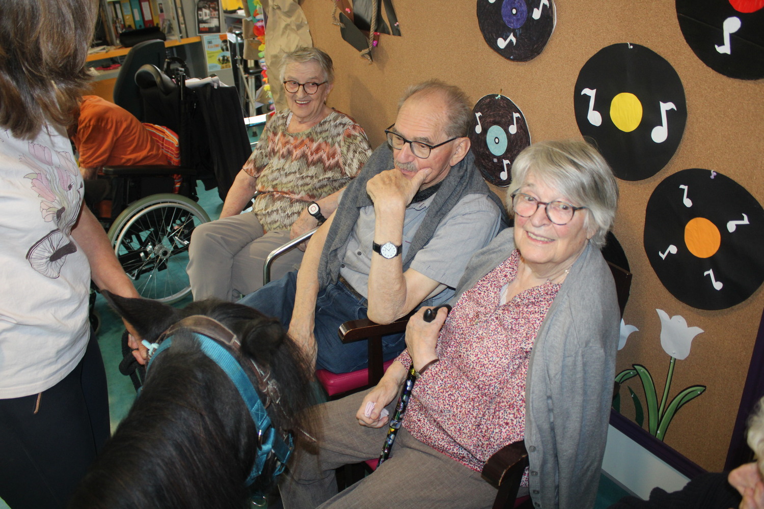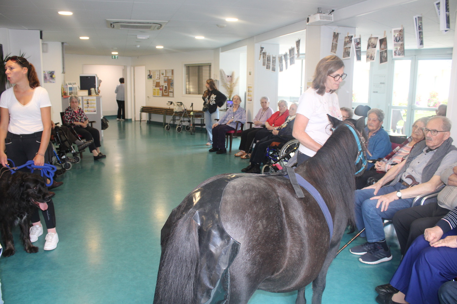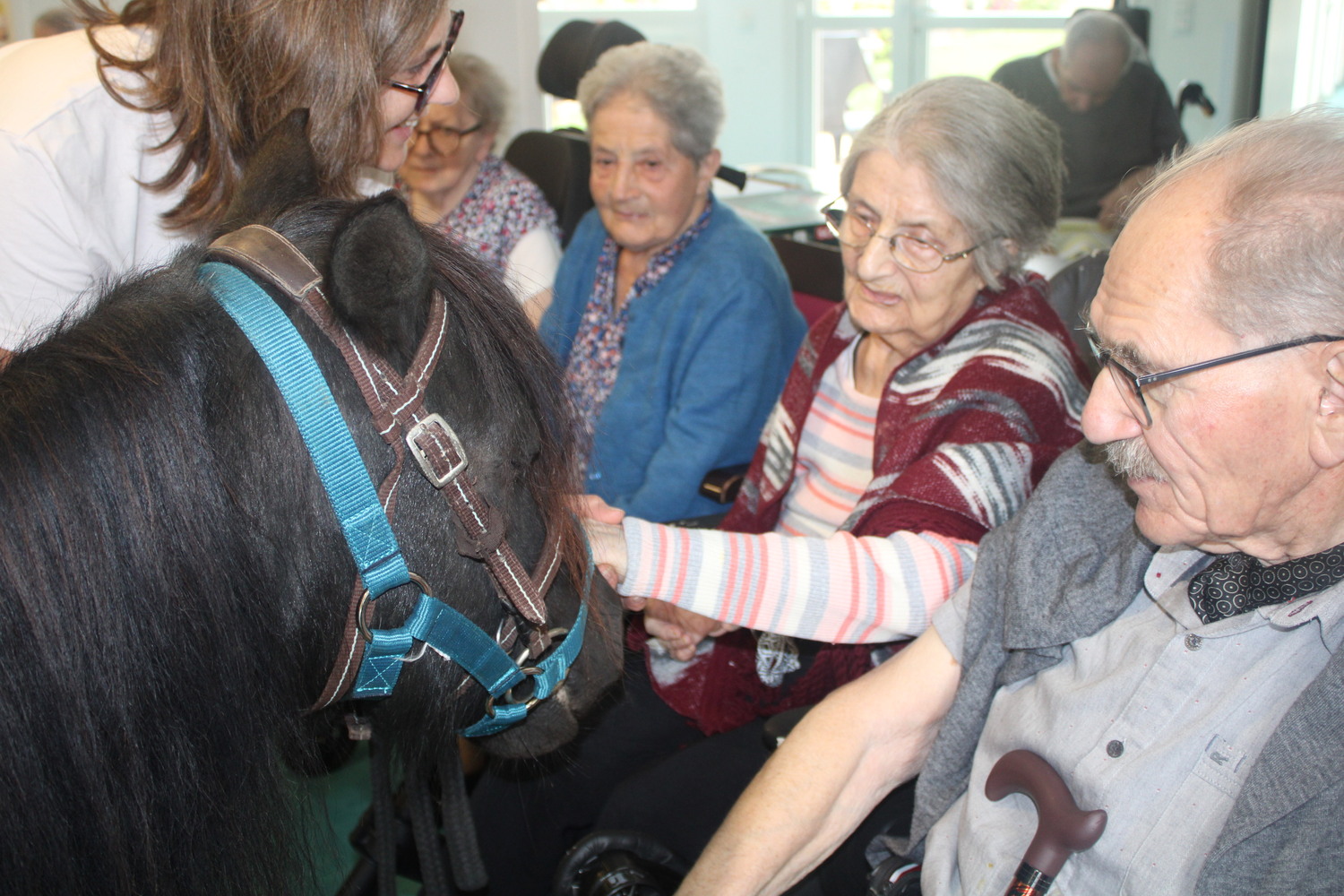 Pour le plus grand bonheur des rĂ©sidents, un poney et un chien sont venus Ă  leur rencontre. Les sourires Ă©taient au rendez-vous : caresses, Ă©changes et moments de tendresse ont rythmĂ© l’aprĂšs-midi.