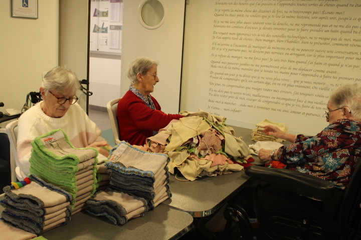 Chaque semaine, plusieurs de nos résidents participent avec plaisir au pliage des mops, des lavettes et du linge. Un moment convivial, partagé, qui s’inscrit naturellement dans le rythme de la journée.